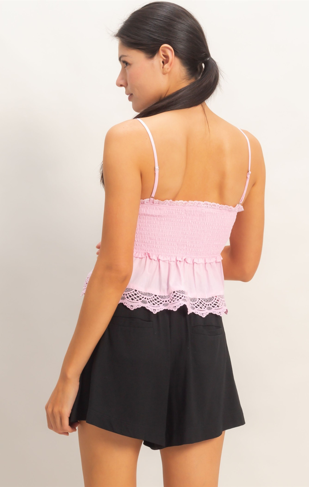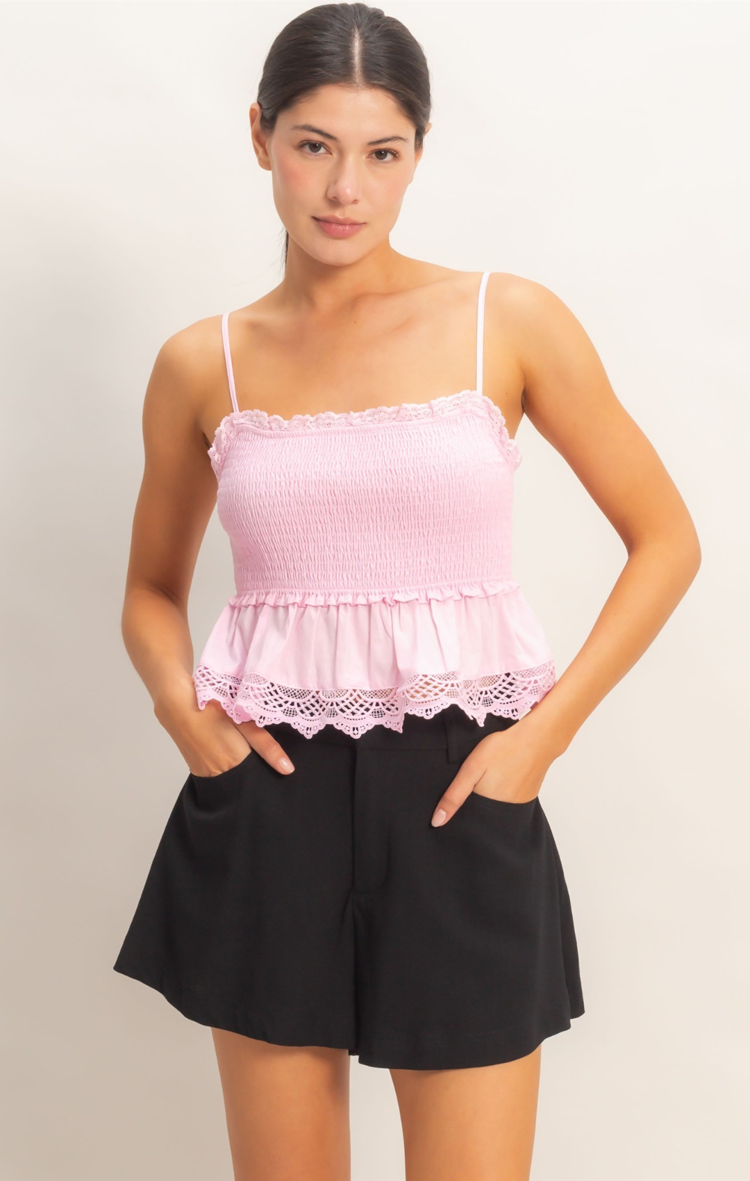 This strap top features delicate smocking across the bust, accompanied by a ruffled waist and intricate lace hem. The silhouette is slightly flared, providing a relaxed fit. Pair with high-waisted denim shorts and sandals for an effortless daytime style.