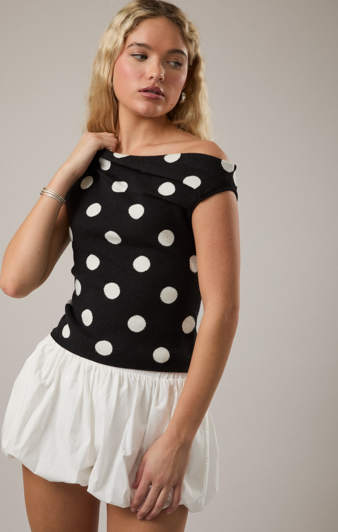 Polka Dot Asymmetrical Sweater Top Make a statement with this polka dot asymmetrical sweater top—a modern twist on a classic pattern that commands attention without trying too hard. The unexpected hemline creates visual intrigue and flatters multiple body types, while the soft knit ensures all-day comfort. Layer it over basics or wear as a standalone piece to elevate your everyday rotation. This is the kind of top that gets compliments and works across seasons, making it an investment piece that earns its place in your closet.