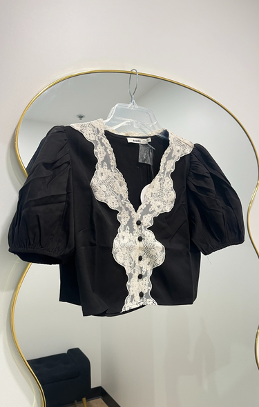 Elevate your wardrobe with this button-down blouse featuring short puff sleeves and delicate contrast lace detailing. Its feminine design adds a touch of elegance while the lightweight fabric ensures comfort all day long. Perfect for pairing with skirts or jeans, this blouse effortlessly blends classic charm with modern style to enhance your everyday look.