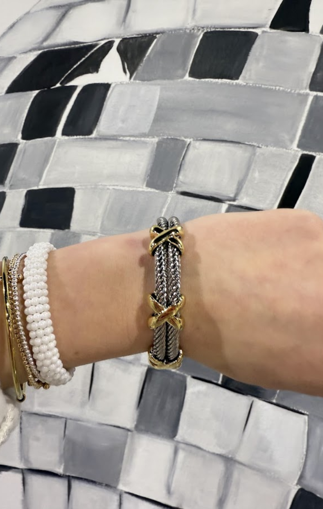 The Row Cable X Bracelet combines timeless cable craftsmanship with contemporary geometric design. A single row of polished cable forms a bold X pattern, creating visual movement and dimension on the wrist. Clean lines and refined execution make this piece equally at home stacked with other bracelets or worn solo for understated impact. The interlocking design offers both durability and elegance, appealing to those who value quality construction and versatile styling. A modern essential that transcends trends.