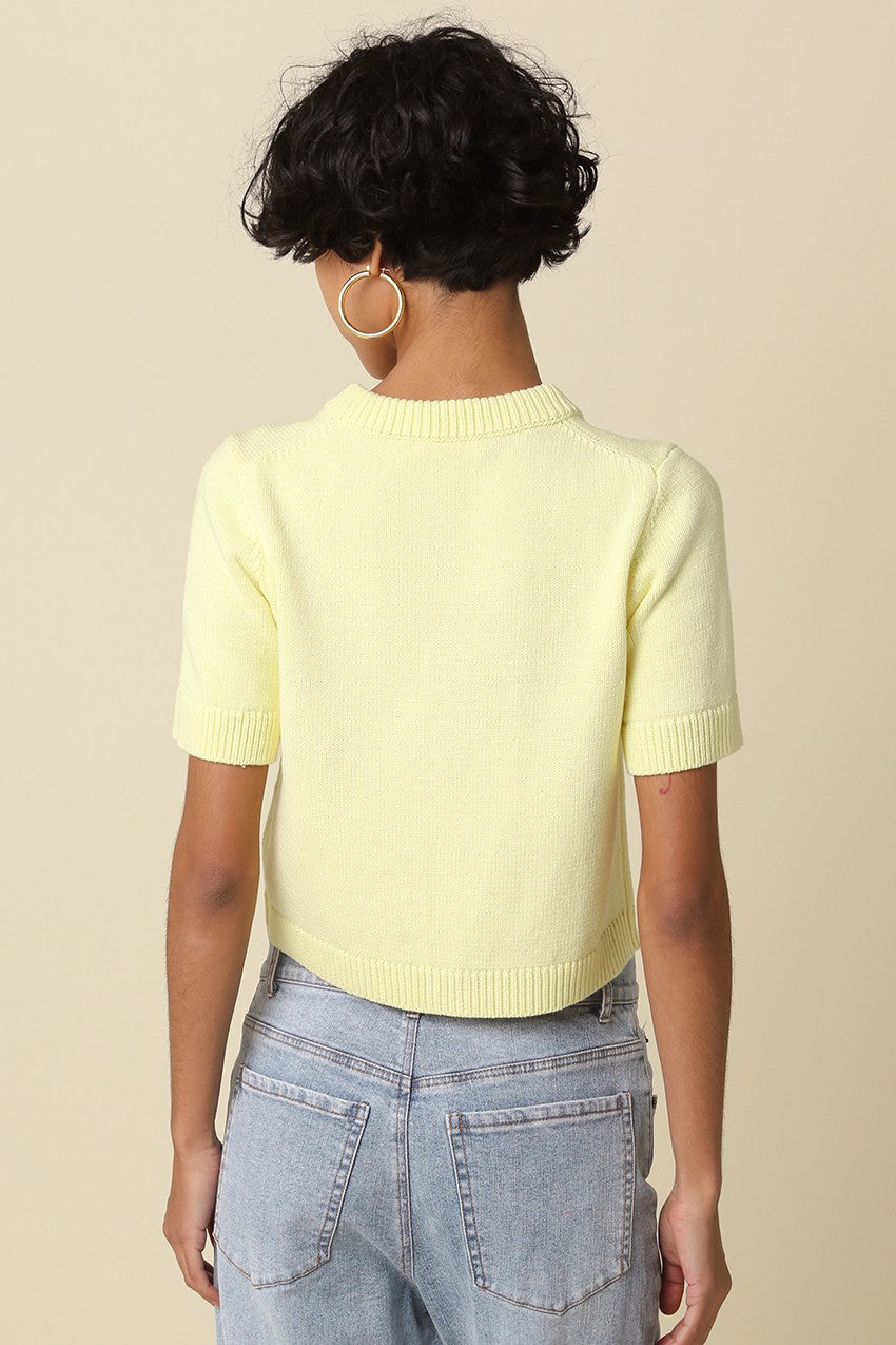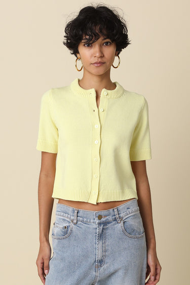 Leia Short Sleeve Knit Top combines timeless style with modern simplicity. The clean button front and collarless neckline create a classic, versatile look that pairs effortlessly with any wardrobe. Cropped length and structured silhouette deliver a polished fit that works for casual outings or layered styling. Perfect for building a foundation of essential pieces.