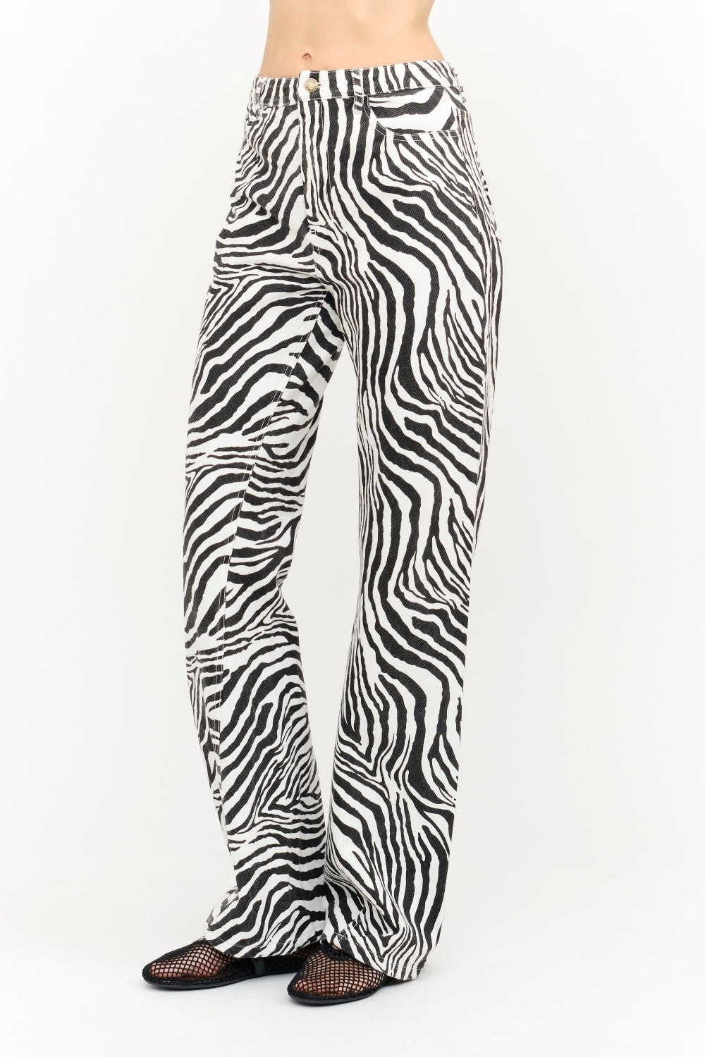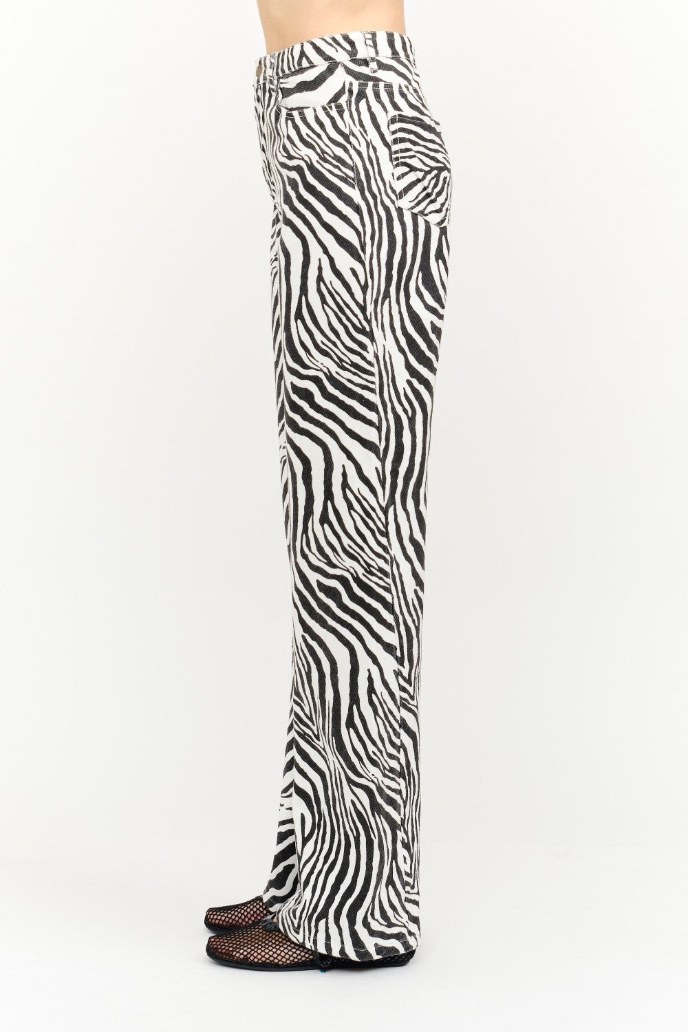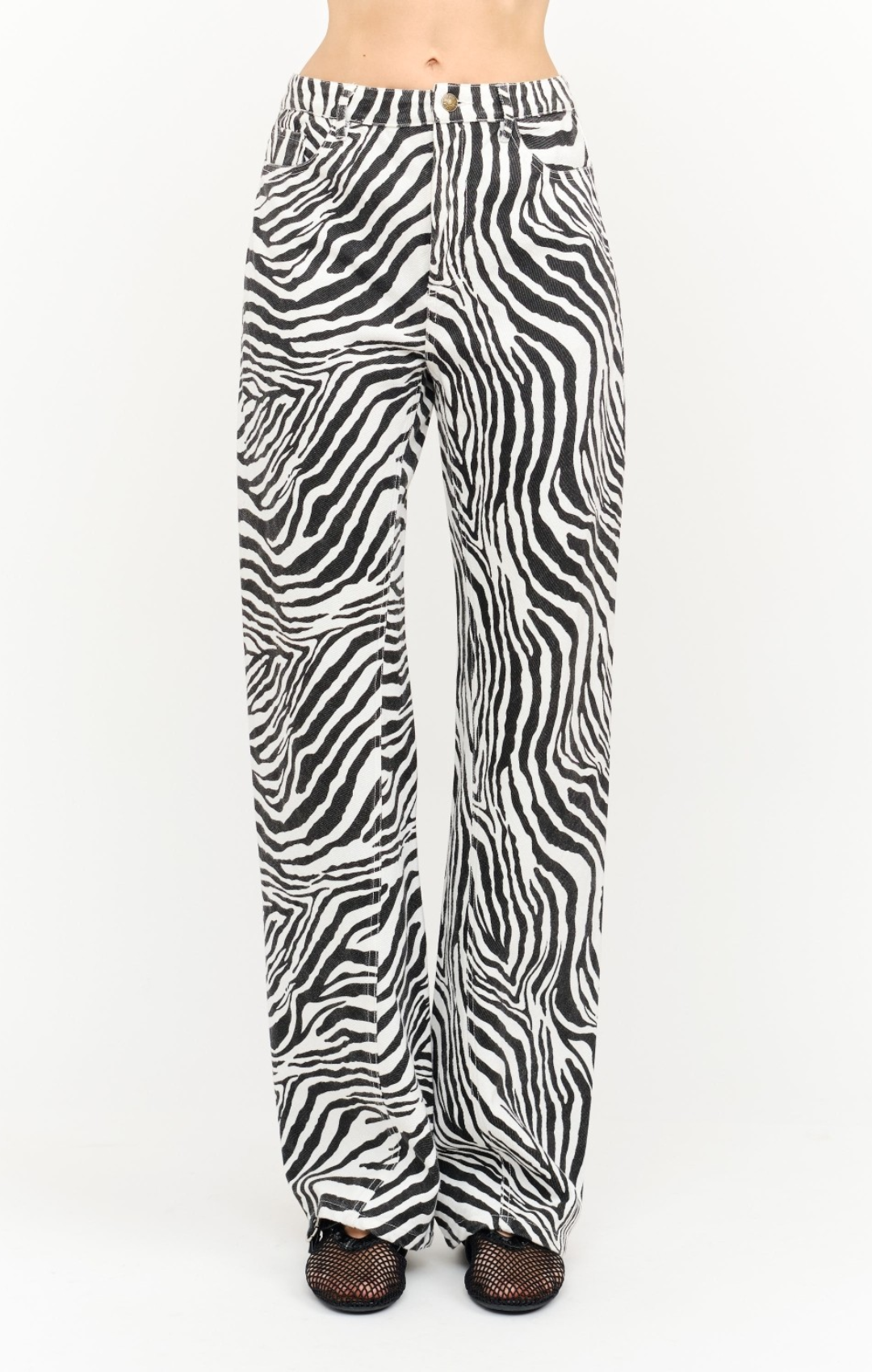 Black and white zebra-print denim pants featuring a low-rise waist and oversized wide-leg silhouette. Designed with classic five-pocket styling, belt loops, and a button-and-zip fly. Statement-making yet effortless, with a relaxed fit throughout the leg.
