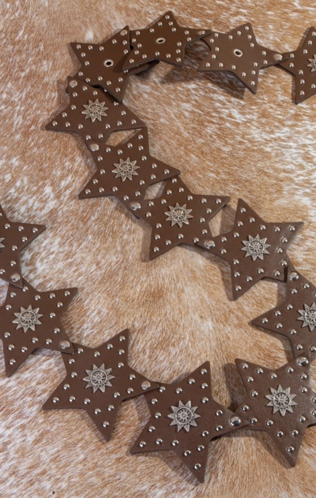This leather belt displays a vibrant studded stars link vegan style. Redefine your look effortlessly with this standout, on-trend piece.