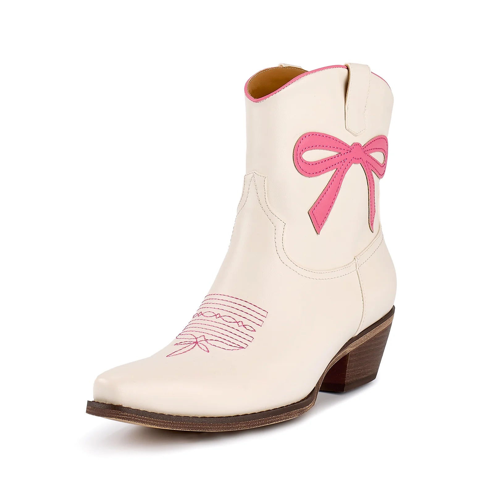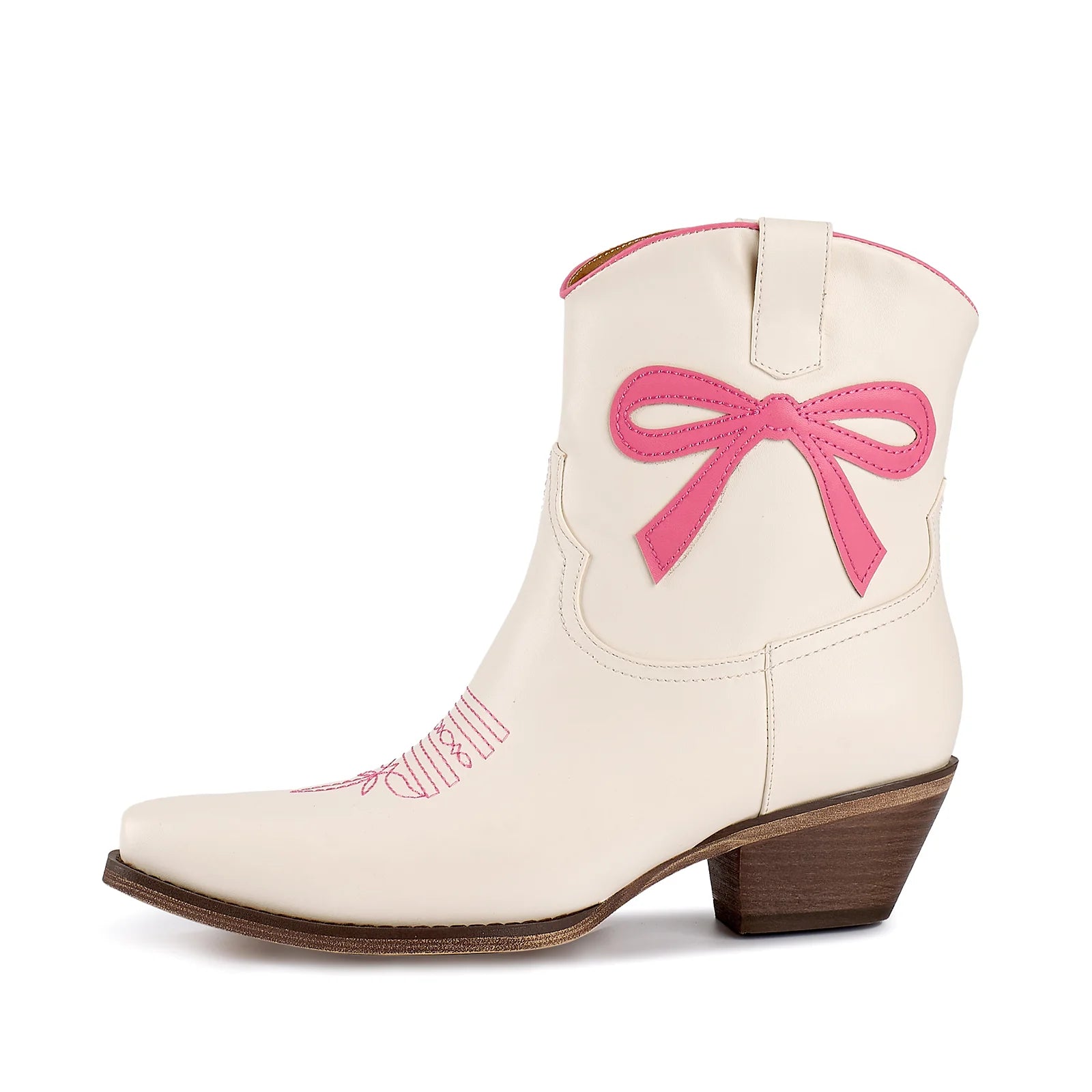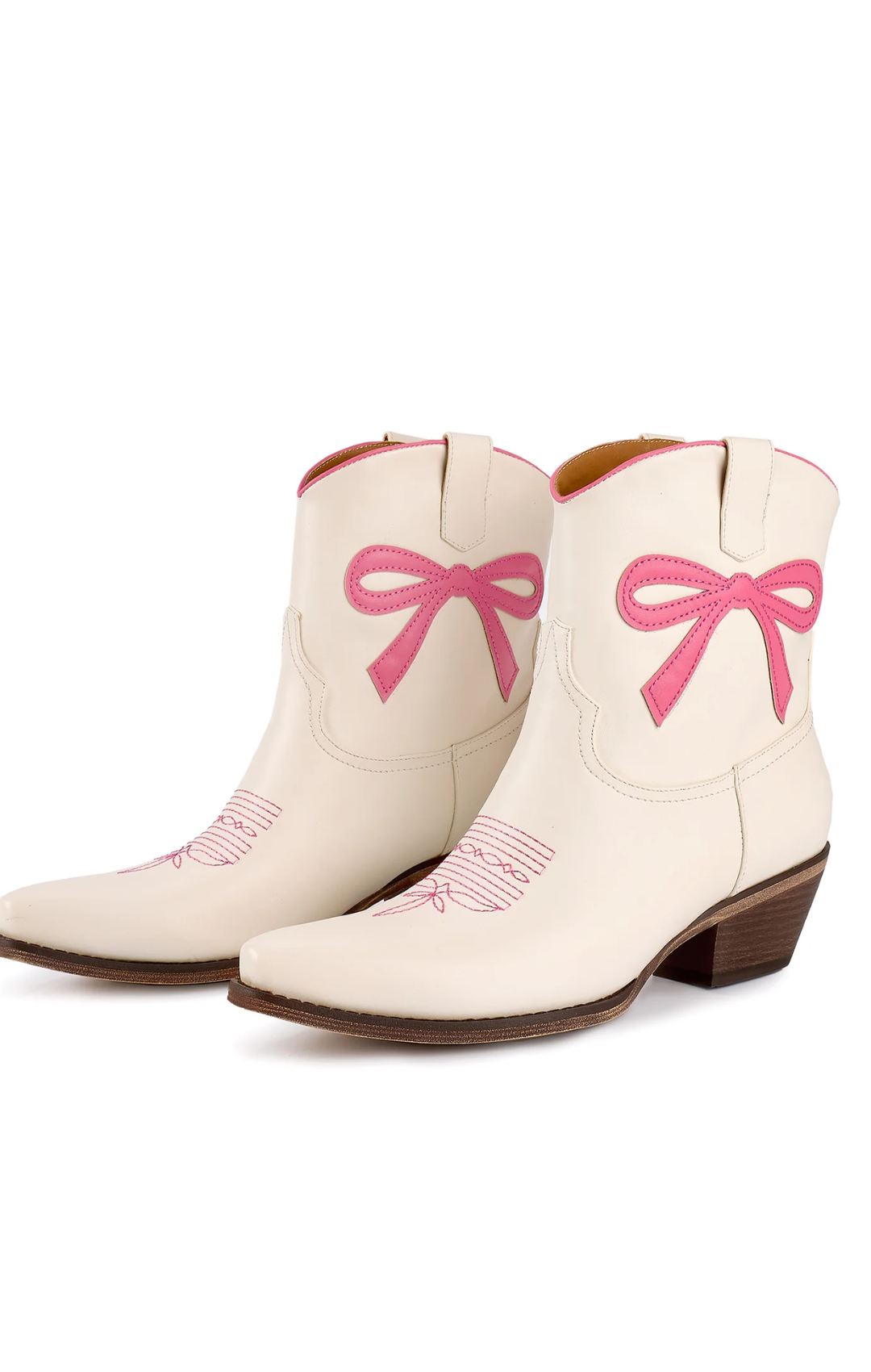 Introducing The Minnie Pearl- the cutest ankle boot that adds a pop of pink to your ensemble with its scalloped collar and bow detail. The pink trim creates a flattering silhouette, making this shorty boot a must-have.