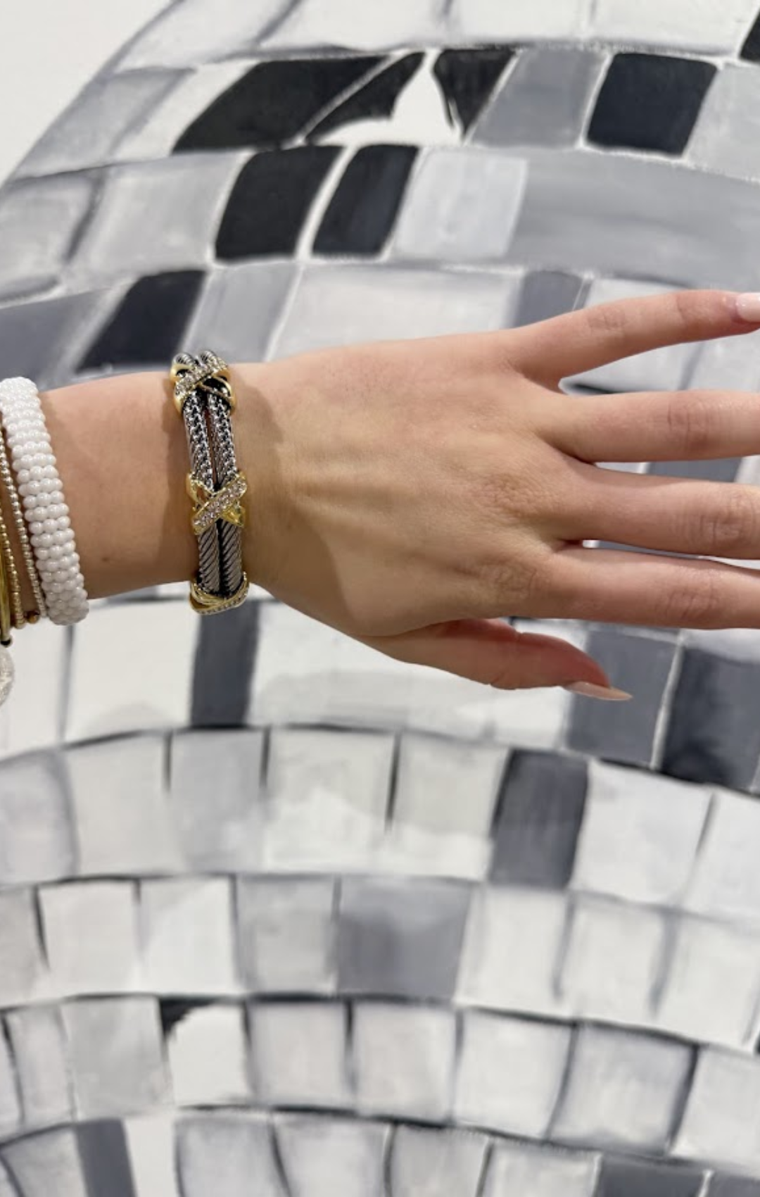 The Two Row Cable X Bracelet reimagines classic cable design with architectural flair. Dual rows of polished cable intertwine in a striking X formation, creating dimensional depth and visual interest that commands attention without overwhelming. The interlocking pattern offers structural integrity while maintaining an elegant, refined aesthetic. Versatile enough to layer with delicate pieces or wear as a bold standalone statement, this bracelet bridges minimalist and maximalist sensibilities. A sophisticated choice for those who appreciate thoughtful design and enduring style.