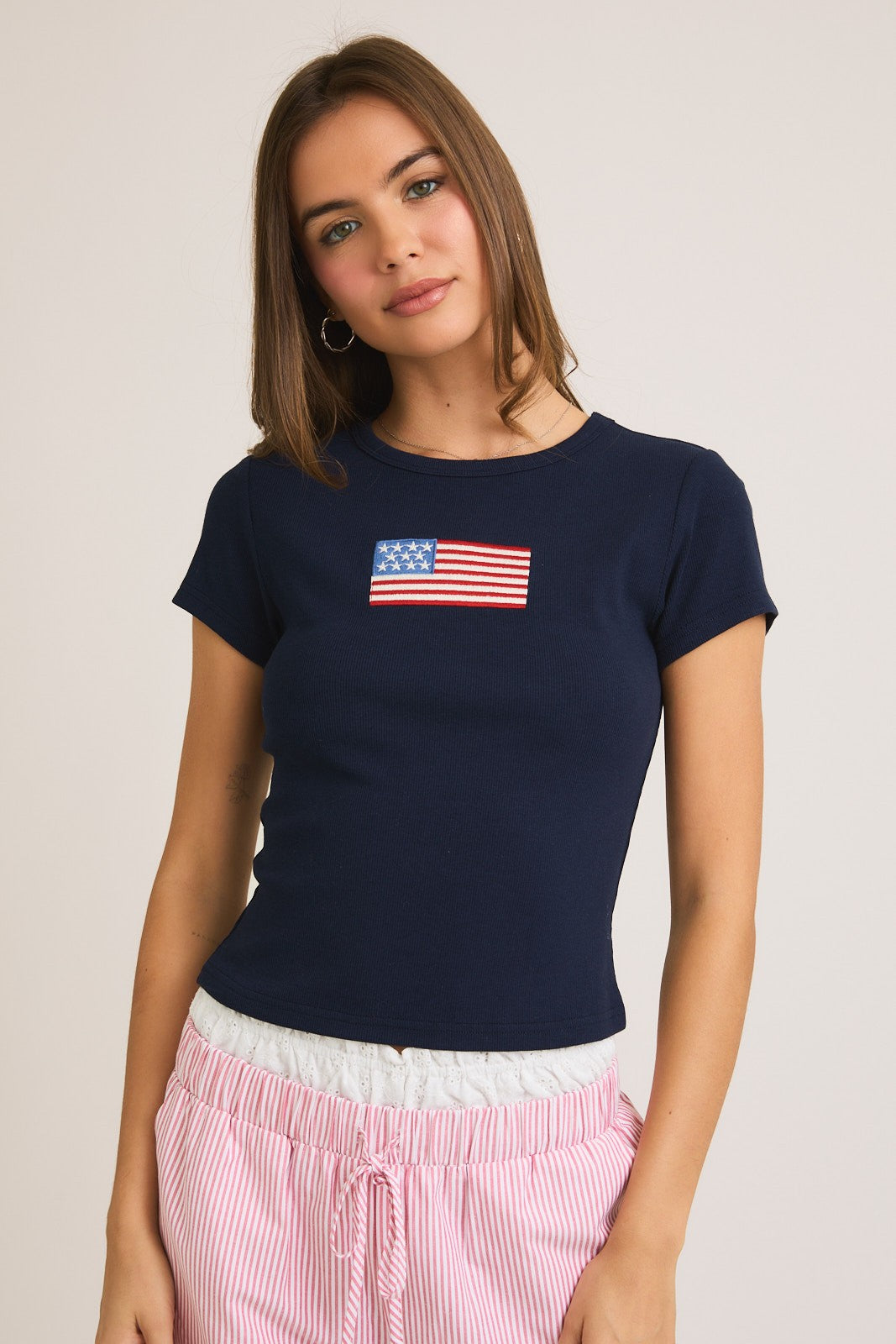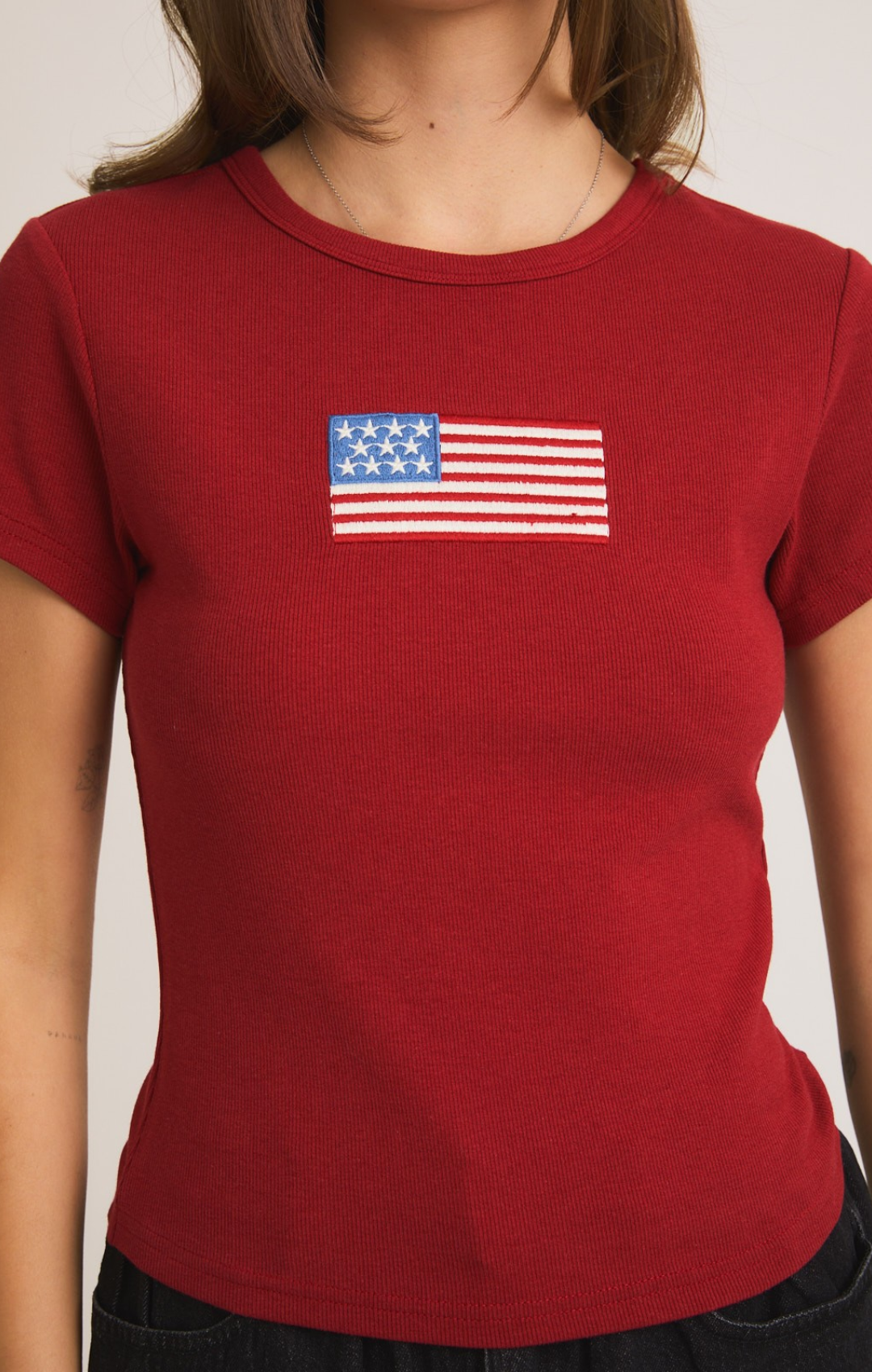 Celebrate patriotic style with this classic USA Flag Baby Tee. Crafted from soft, breathable cotton, this fitted tee features a bold, iconic flag graphic that makes a statement. Perfect for casual wear, summer outings, or showing your American pride. The timeless design pairs effortlessly with jeans, shorts, or layered pieces. Comfortable, versatile, and made to last—a wardrobe essential for any occasion.
