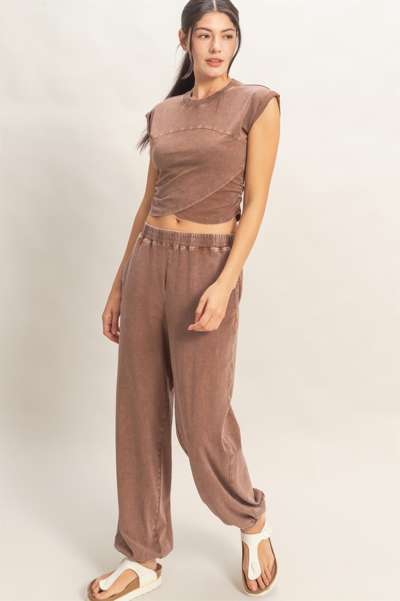 Crafted from a soft cotton-spandex, this set features a mineral wash texture for a lived-in feel. The top includes a classic crew neckline, rolled extended shoulders, and a wrap-front detail. The joggers feature a high-rise elastic waistband, side pockets, and a cinched elastic hem. Pair with statement sneaks for a stylish ensemble.